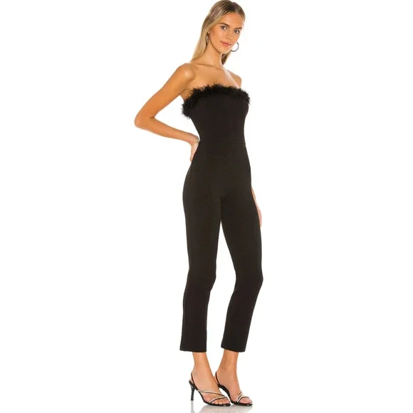 Lovers and Friends Demi Jumpsuit in Black NWT Size SmallSelf: 90% rayon, 10% elastaneTrim: 100% turkey featherHand wash coldHidden side zipper closureBoned bodiceFeather trimJersey fabricNeckline to hem measures approx 47" in length14" at the knee narrows to 12" at the leg openingImportedRevolve Style No. LOVF-WC140